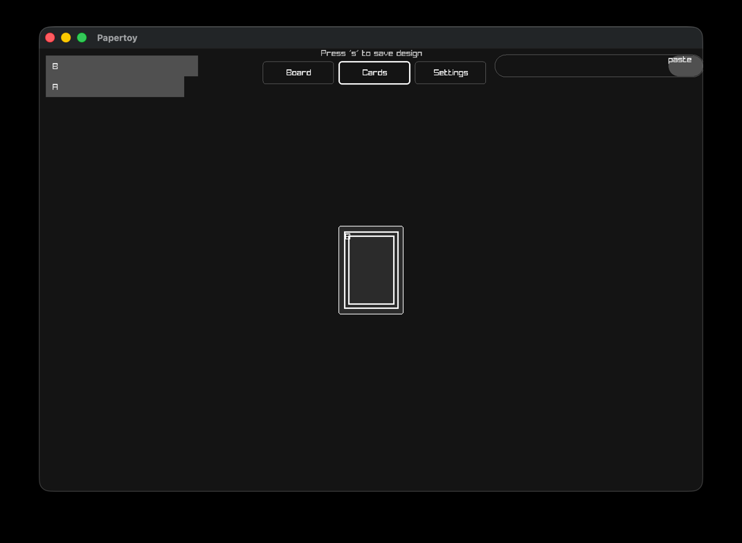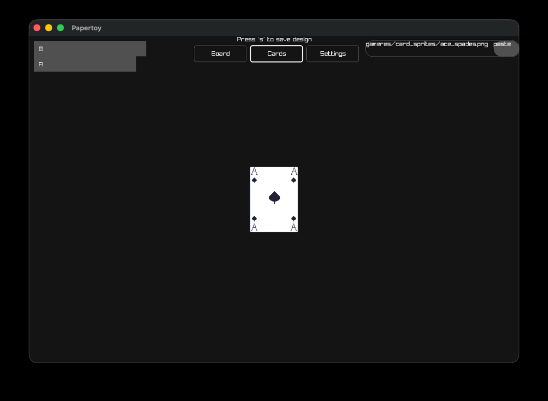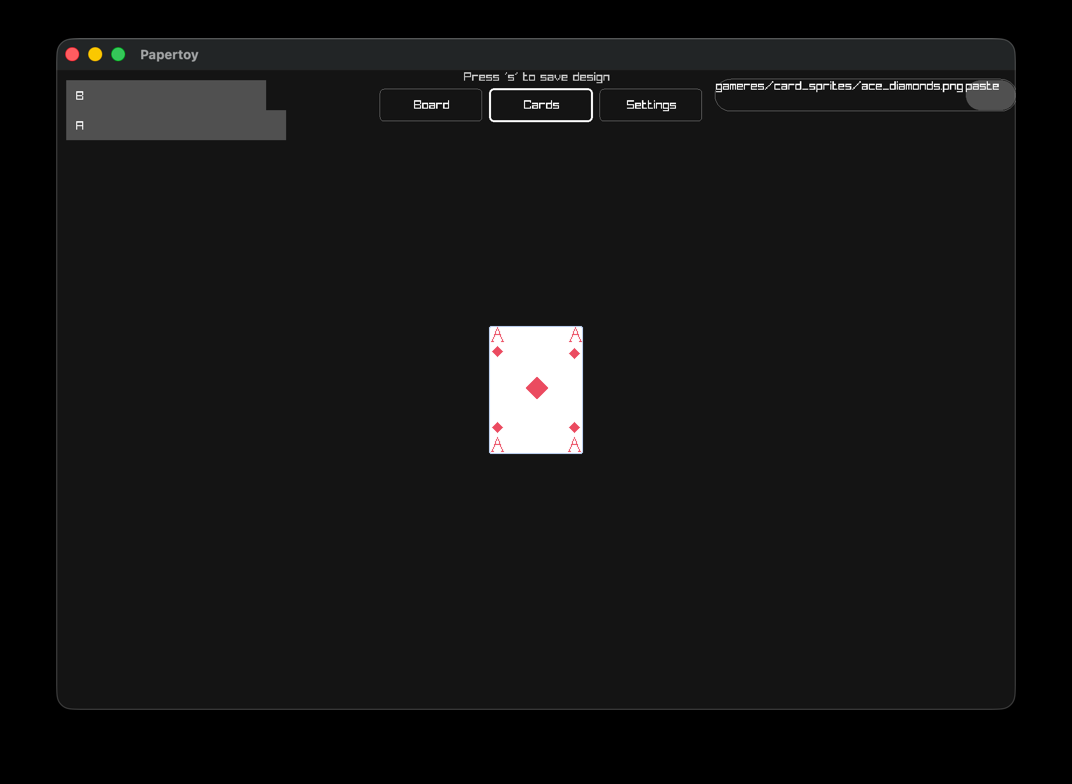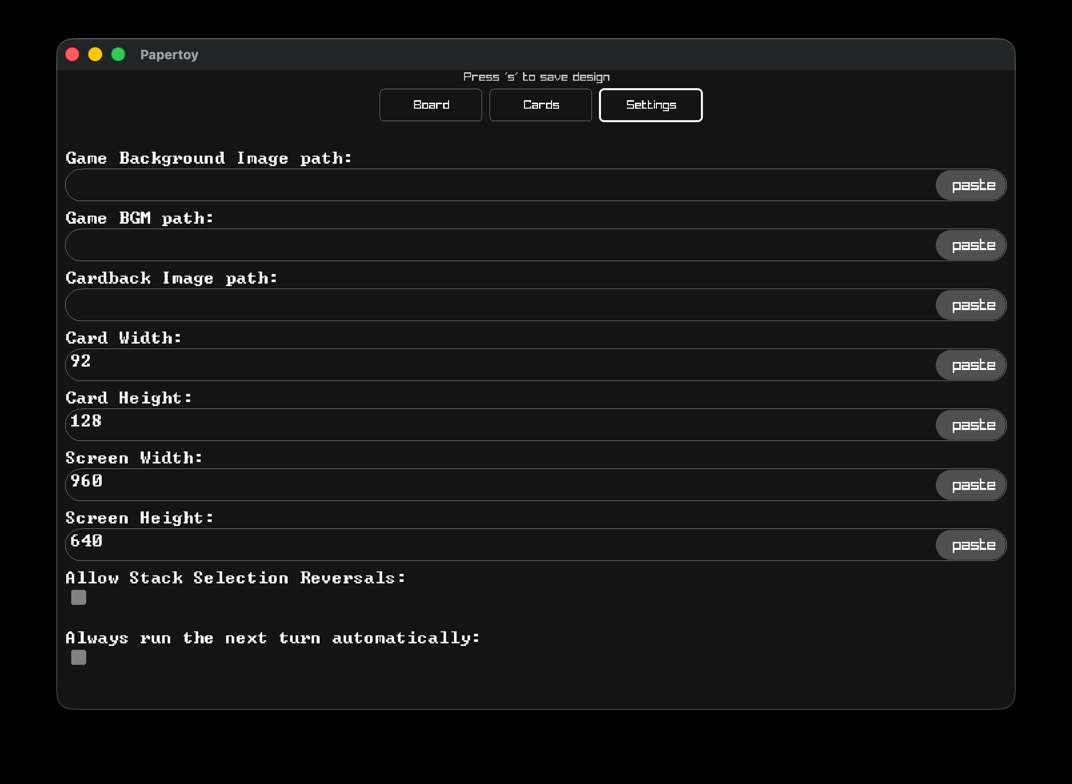 Feel free to play around with these settings. Remember to save your changes to the design file by pressing 's' while on ANY design screen (board, cards, settings). Also, check out the design file after you've changed a setting to see how it's changed. Remember you can always make manual changes to the design file.