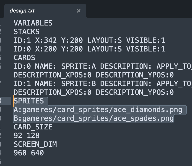 Notice the highlighted SPRITES section, this is where we put our sprites, the format is SPRITE_NAME:PATH, the designer automatically sets the name to the name of the corresponding card.